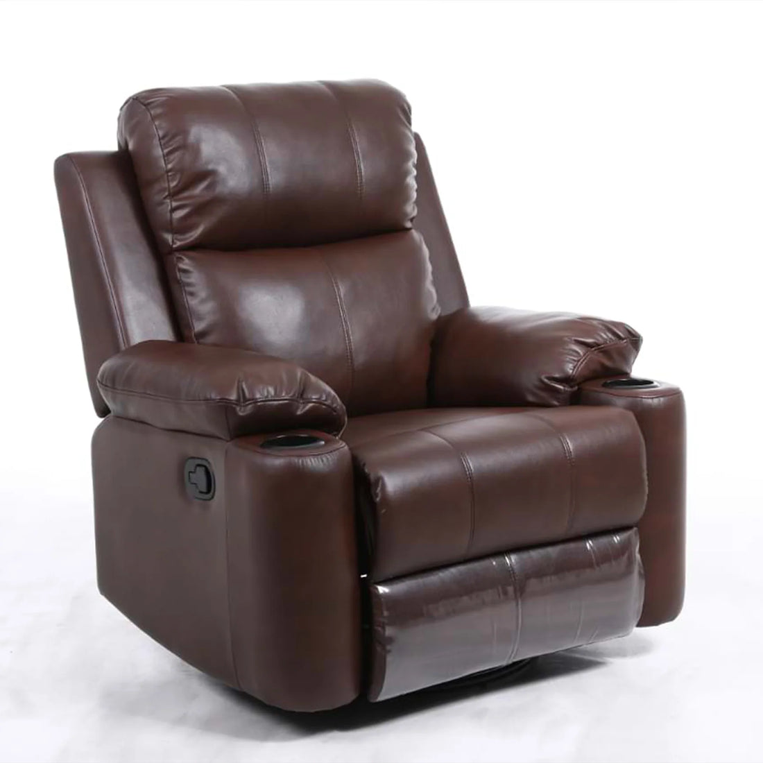 This deep brown recliner combines premium leather with built-in cupholders and storage. Its classic cushioned design...