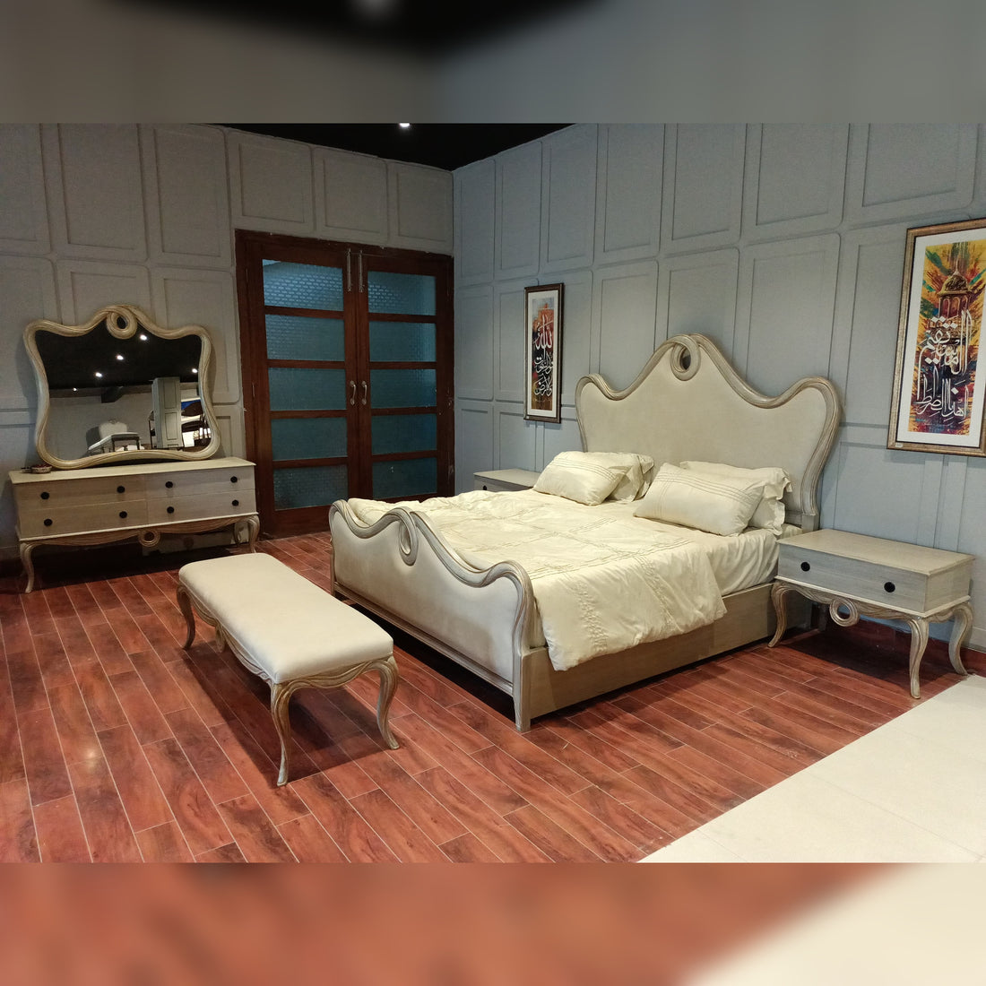 Bed Set + Dressing frame with Ottoman A sophisticated bedroom setup with tufted bedframe and coordinating...