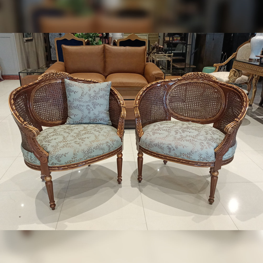 Elegantly upholstered chairs with floral brocade fabric and carved wooden frames. Their rounded backs and...