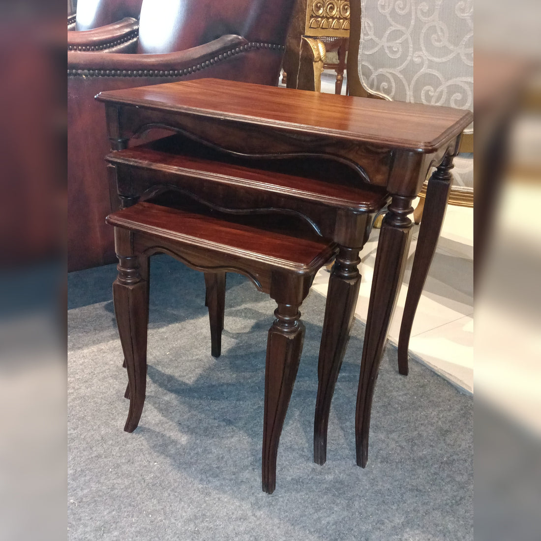 Wooden top with a geometric parquetry pattern and curvy cabriole legs, combining craftsmanship and elegance....