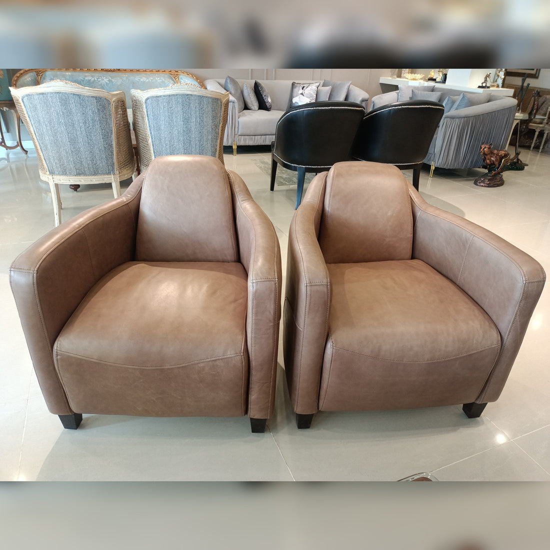 These low-profile armchairs are upholstered in distressed brown leather. Their sleek, angular form makes them...