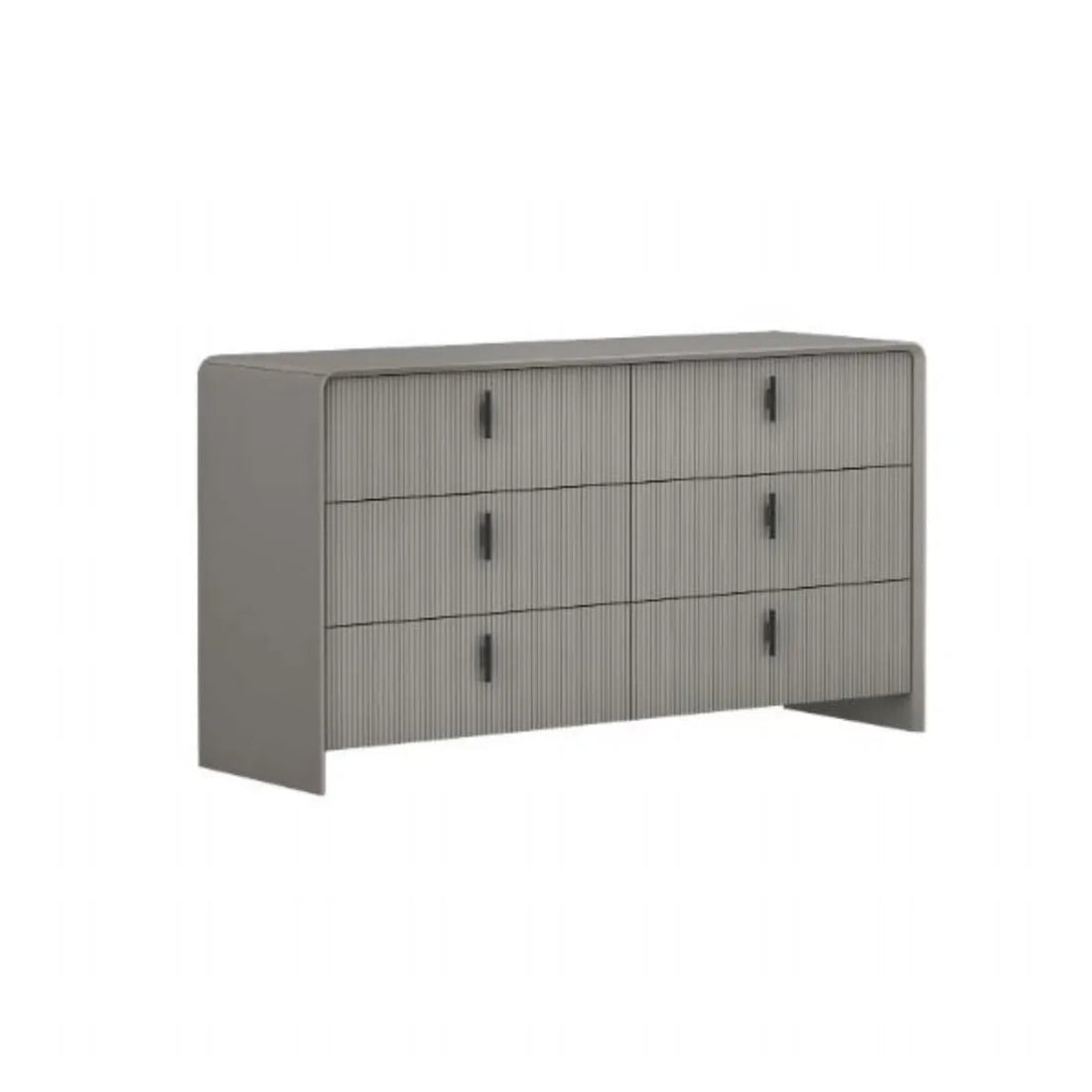 A contemporary cabinet featuring a matte blue finish with vertically grooved panels. The upper section...