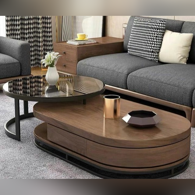 A clever composition of two conjoined tables—one circular and the other an elongated oval—each with...