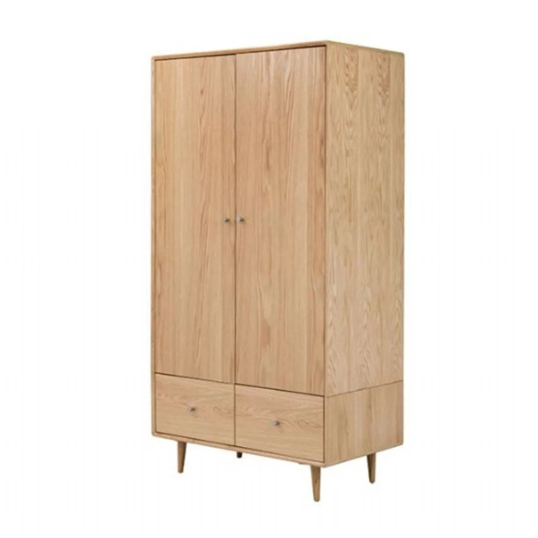 This spacious wardrobe features a natural wood grain with three doors and lower drawers. The...