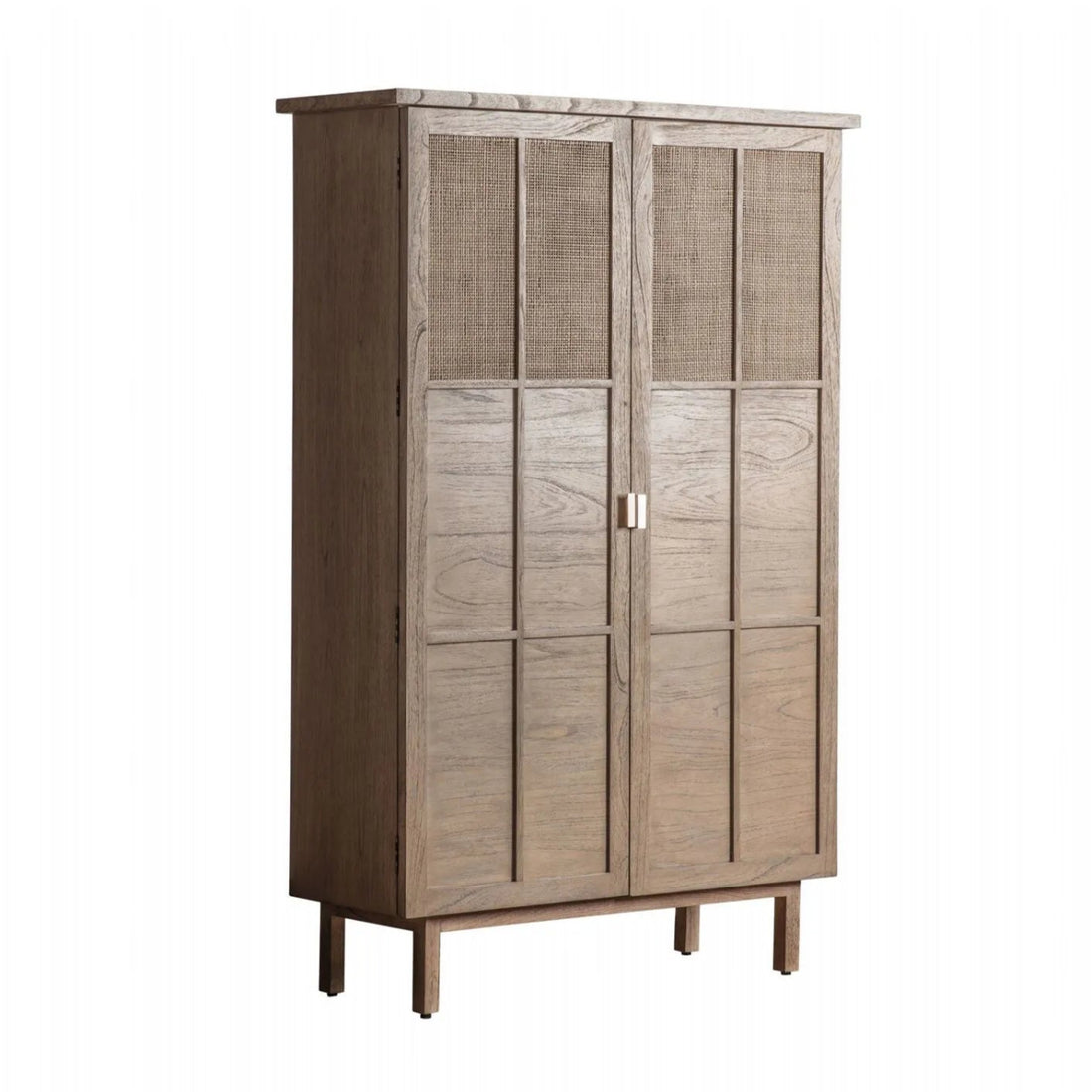 A rustic wood cabinet that stands out with a blend of solid and cane paneling...