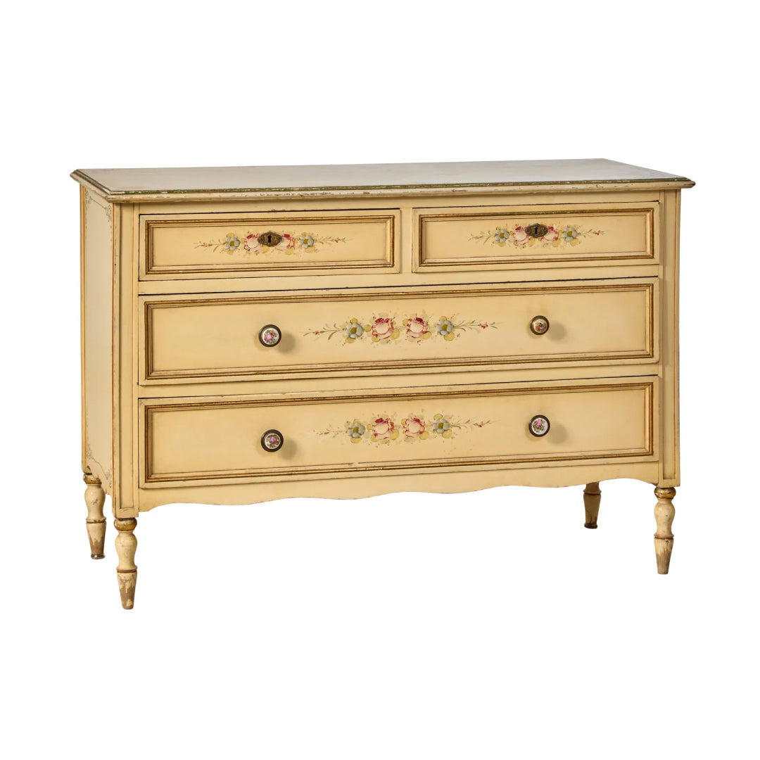 This chalk-finished chest carries a soft, vintage patina that highlights its floral carving details.The distressed...