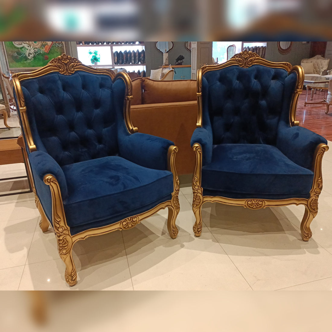 These luxurious velvet armchairs come in a striking royal blue with intricate carved gold frames....