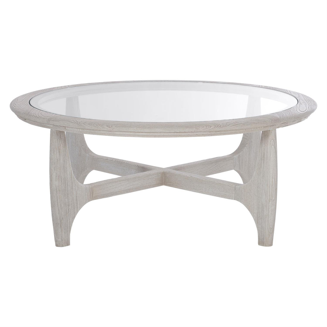 This airy and coastal-inspired table features a round clear glass top supported by a sculptural...