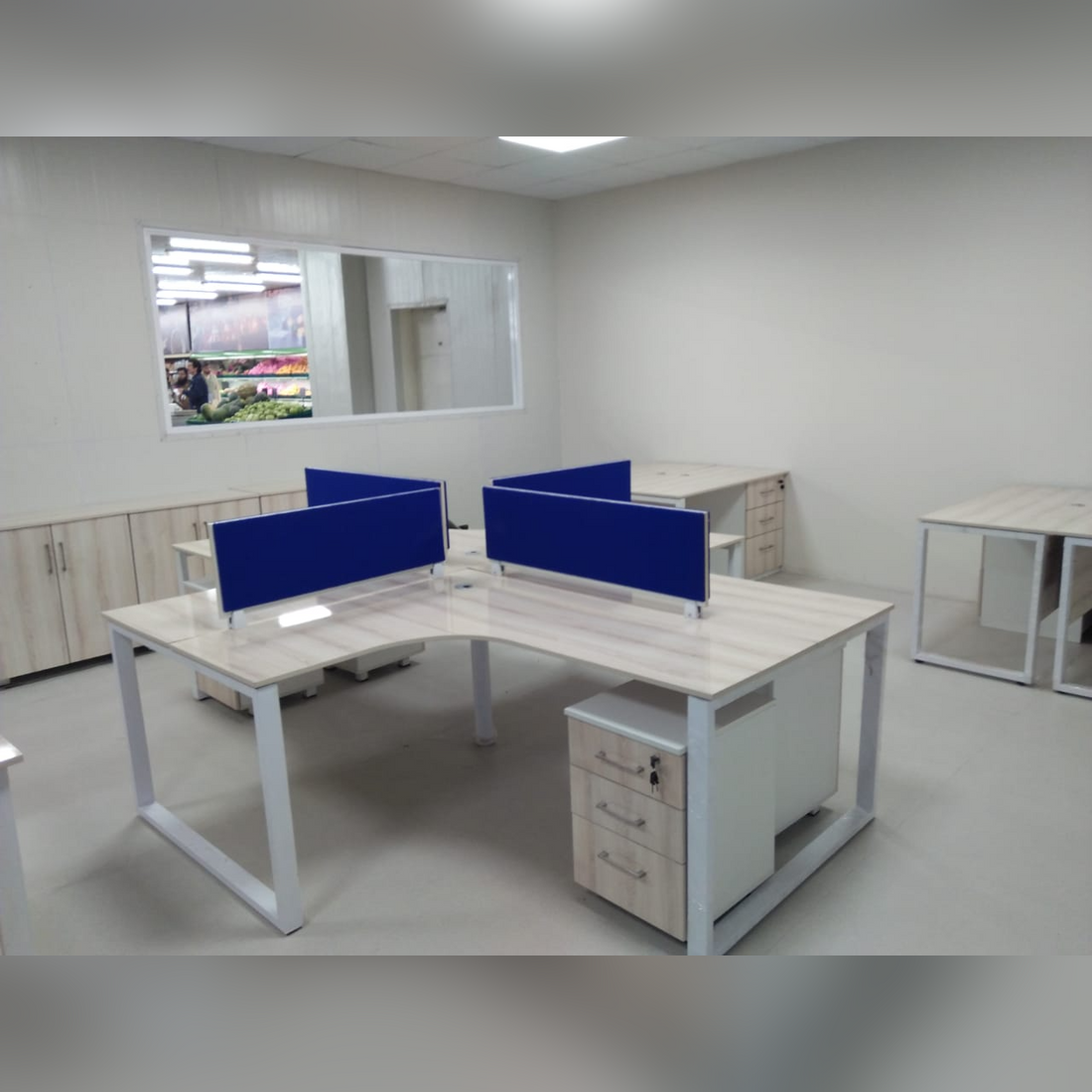 Designed for corner arrangement, this setup supports four users with X-shaped desks and blue privacy...