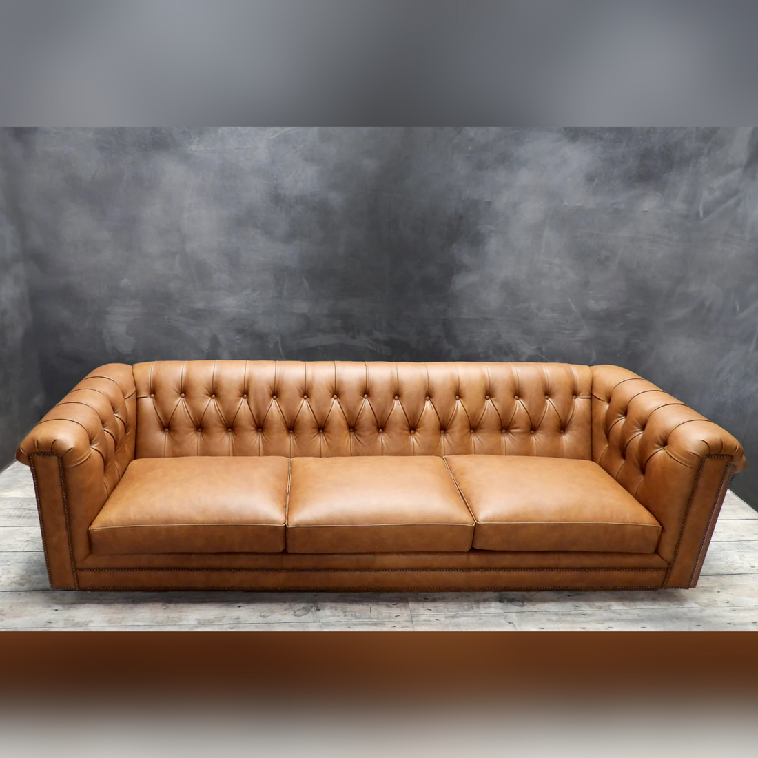 This sofa blends burgundy leather with classic Chesterfield elements—deep tufting and scroll arms. Elegant and...
