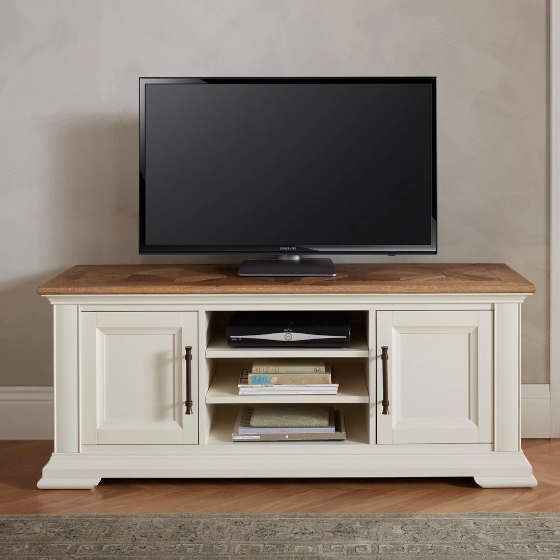 Featuring a warm wood top and white painted body, this unit includes paneled doors and...