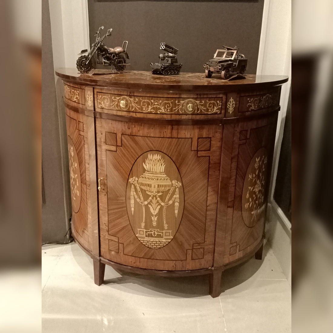 A semi-circular cabinet with exquisite marquetry and inlaid floral patterns. Rich wood tones and traditional...