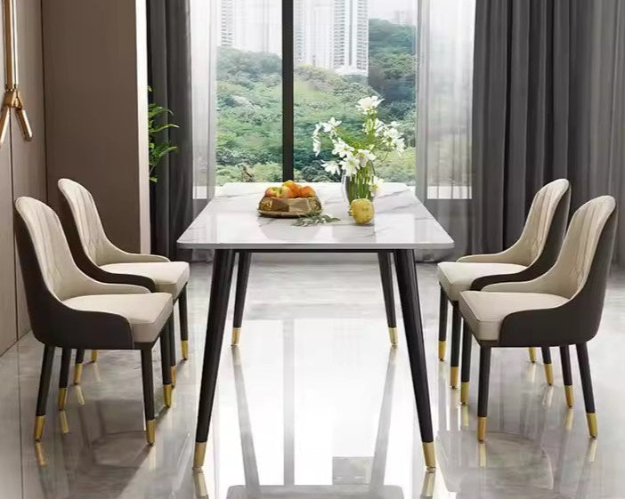4 Person Dining Table Set A sleek white rectangular tabletop with black tapered legs, exuding...