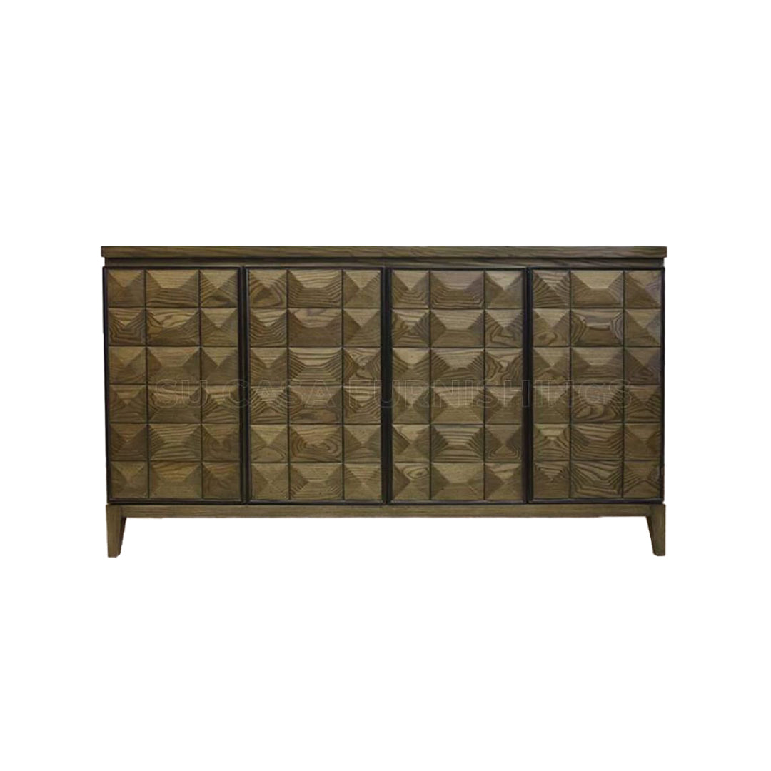 This striking sideboard showcases a unique 3D geometric pattern across its entire front, finished in...