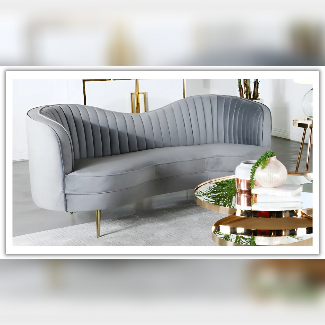 This dreamy grey velvet sofa stands out with its scalloped, shell-like backrest and elegant gold-finished...