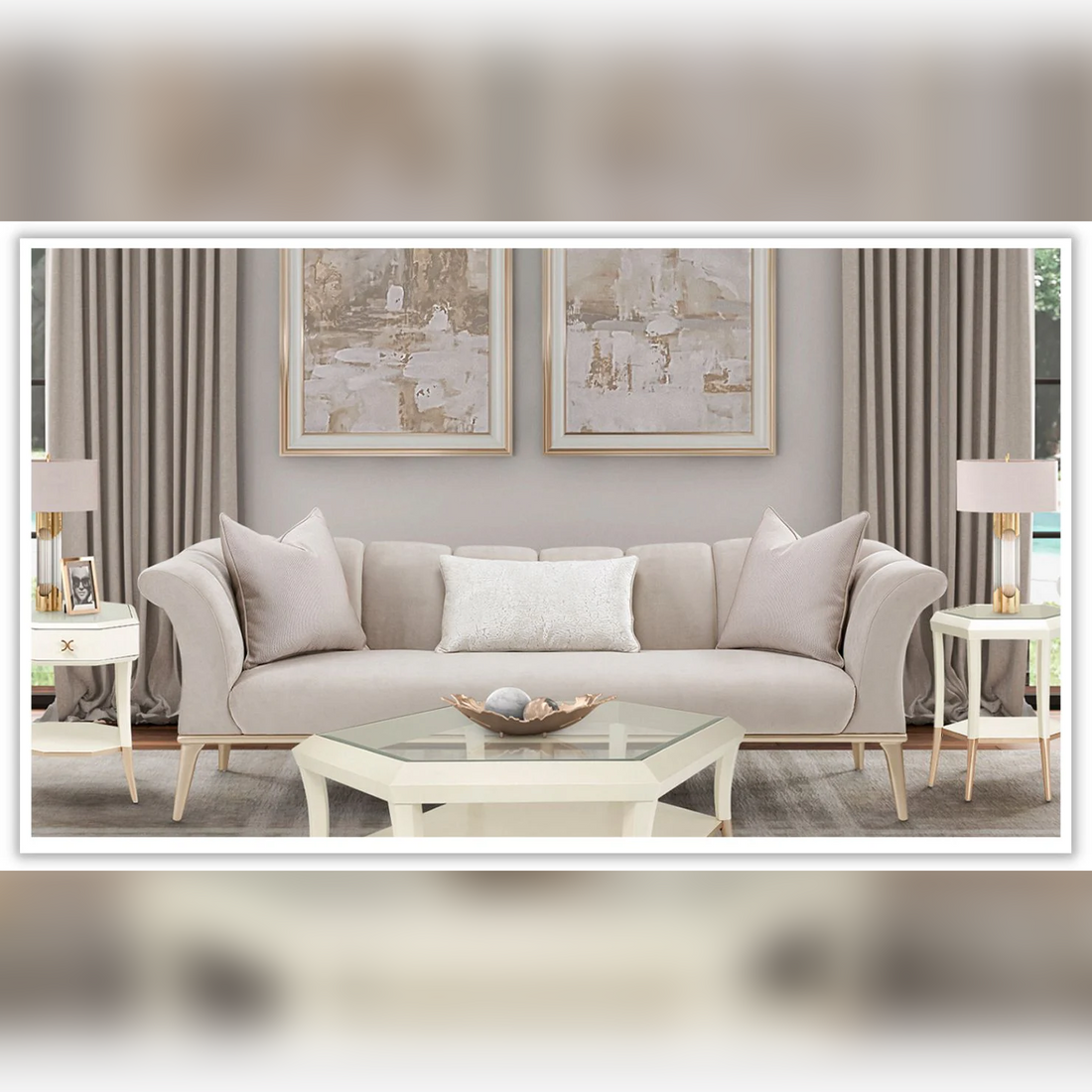 This light beige velvet sofa displays minimalist elegance with its airy design and slender silhouette....