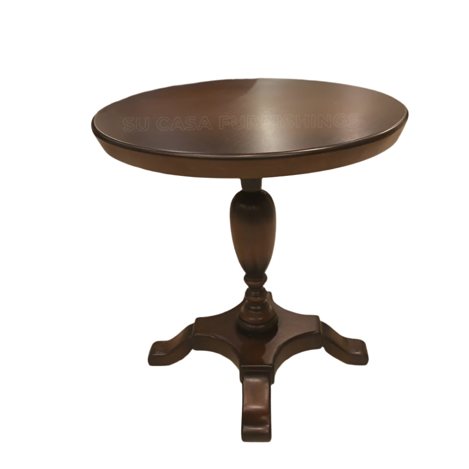 Dark polished finish, round top, and a thick turned central support with three legs, conveying...