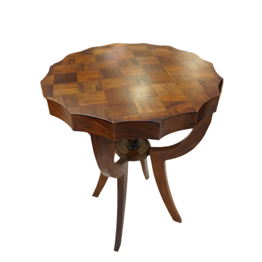 Wooden top with a geometric parquetry pattern and curvy cabriole legs, combining craftsmanship and elegance....