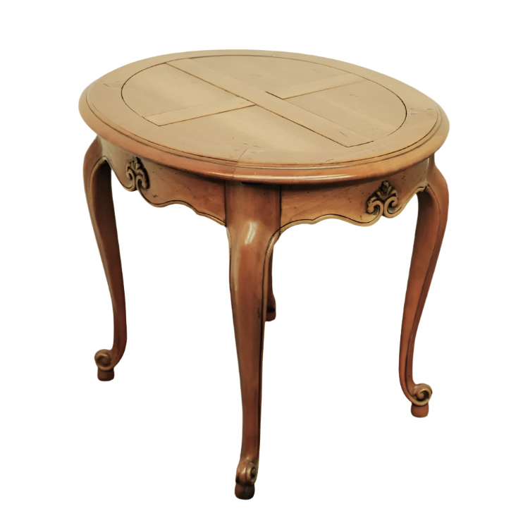 A light-finish round table with delicately carved cabriole legs and minimal apron design, offering a...