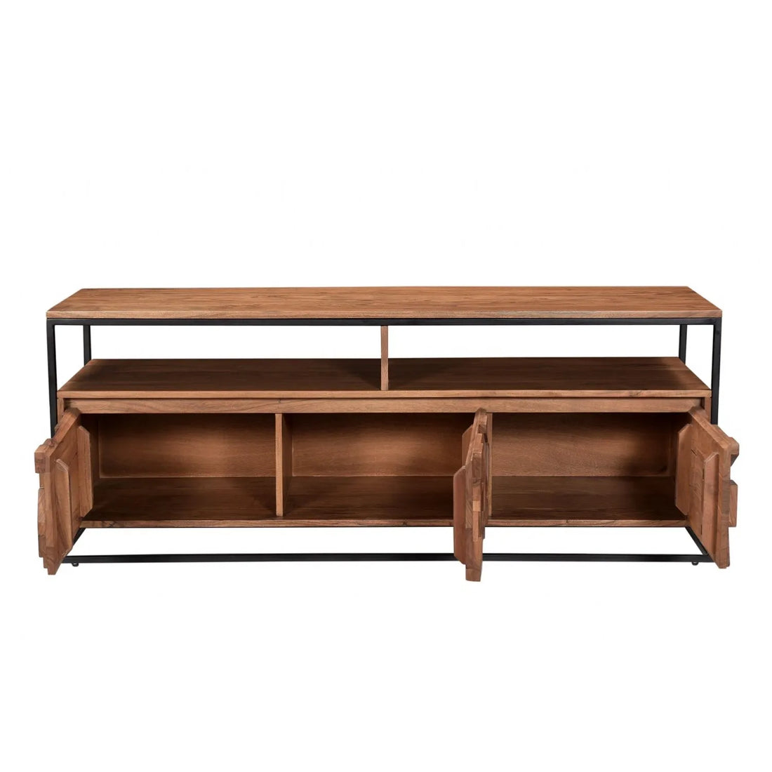 This unique TV unit features geometric textured wood drawers framed in a black metal body.The...