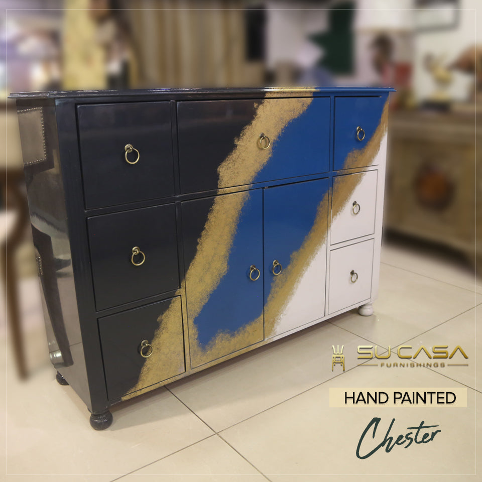 A work of functional art, this piece features a striking hand-painted abstract design in navy, gold, white, and black. Asymmetrical drawer placement and angular detailing lend it a playful yet bold presence, making it ideal for eclectic and artistic home spaces.