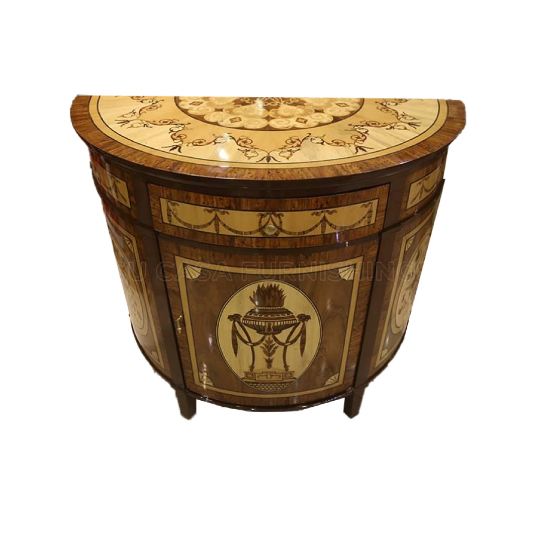 Solid rosewood lends strength and beauty, while a deep brown lacquered finish exudes richness. Delicate inlay artistry and luminous gold handles add sophistication to the drawers and cabinet doors, offering both form and function.