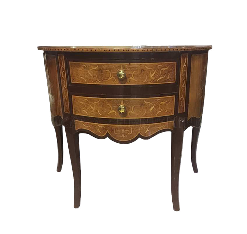 Crafted in a polished wood base, this chest features delicately painted floral inlays on each drawer front. High Gloss work enhances the carved scrolls, creating soft contrast and depth. A unique union of timeless craft and painterly detail.