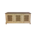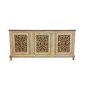 Finished in a soft ivory tone with a distressed patina, this classic sideboard displays intricate lattice-style wood carving on its cabinet doors. The symmetrical design, supported by turned legs, evokes a timeless colonial charm. Its neutral palette allows it to blend effortlessly into traditional or eclectic decors.