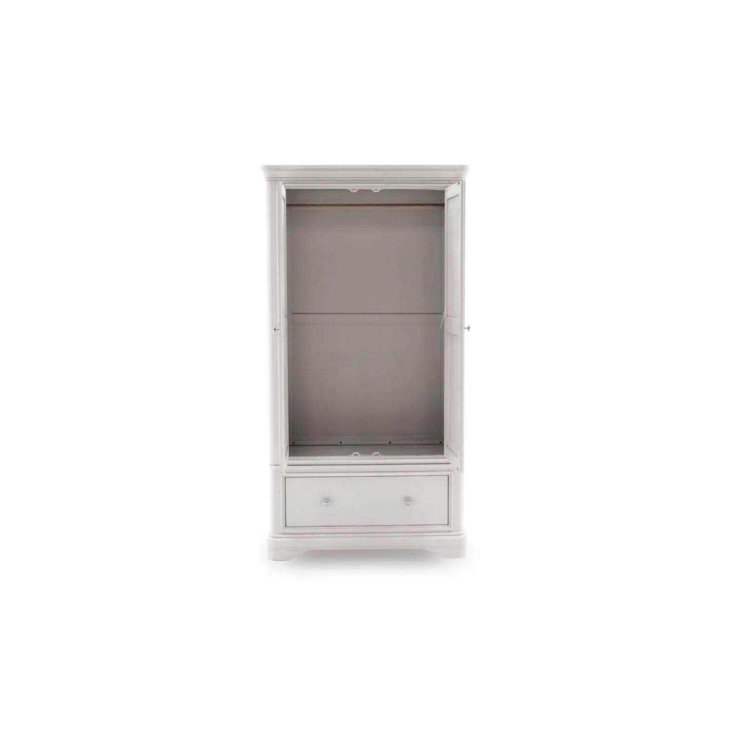 Inspired by classic detailing, this tall cabinet has framed panel doors and a single drawer at the base. Painted in an elegant grey tone, it brings a timeless, formal presence to the room. Crown molding and base trim enhance its traditional charm.