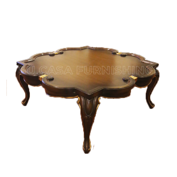 Wooden table with scalloped edges and curved legs in dark walnut finish, reflecting a romantic Rococo style.