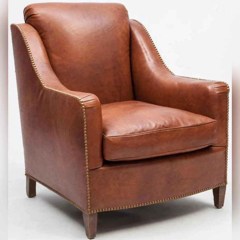 This stylish chair features a rounded barrel-back silhouette in rich cognac leather. The plush seat and gently flared arms ensure comfort. Ideal for casual lounges or reading spaces.