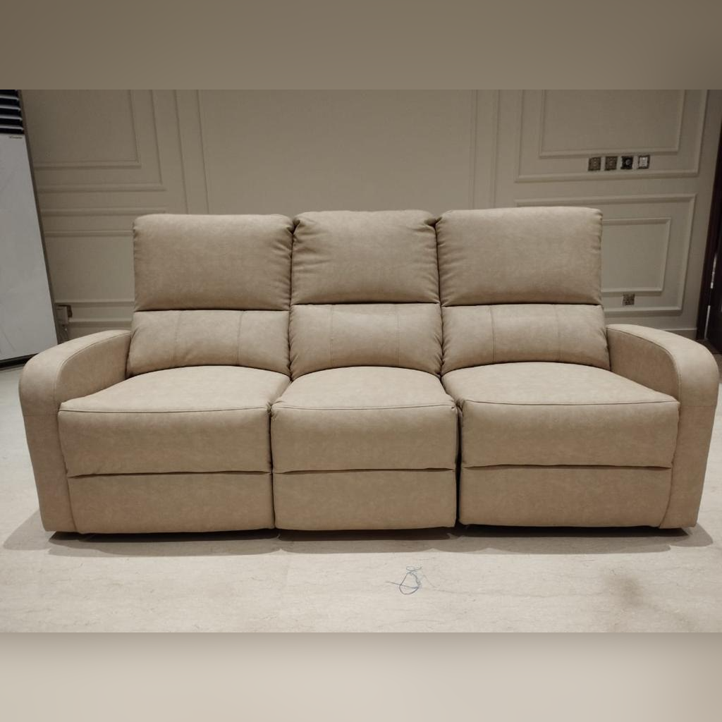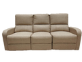 This three-seater recliner sofa in beige fabric offers all-seat reclining functionality. The wide armrests and high back enhance comfort for family lounging. A neutral tone and clean lines make it adaptable to most living rooms.