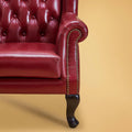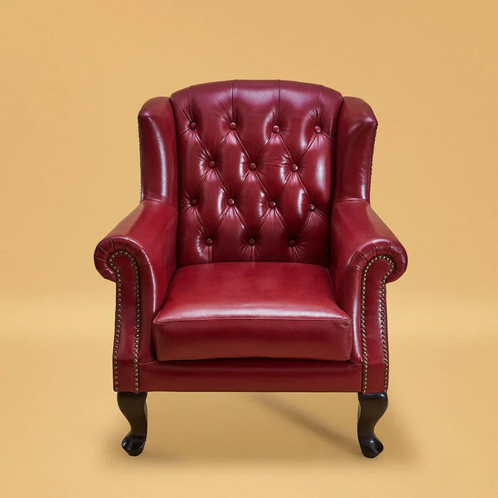 This bold armchair features deep button tufting and elegant scroll arms. Upholstered in glossy burgundy leather with cabriole legs for a vintage look. A statement piece for luxury interiors.
