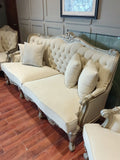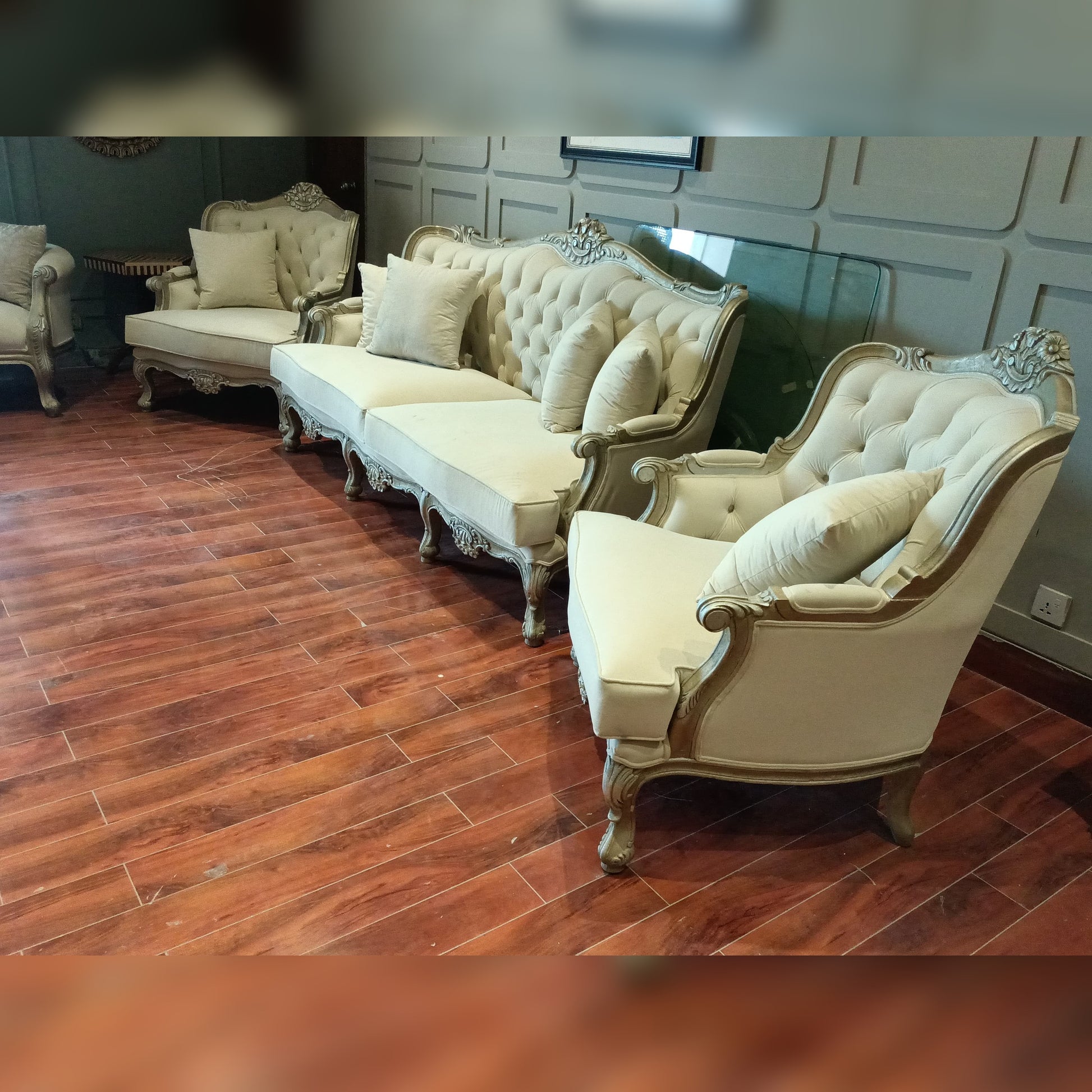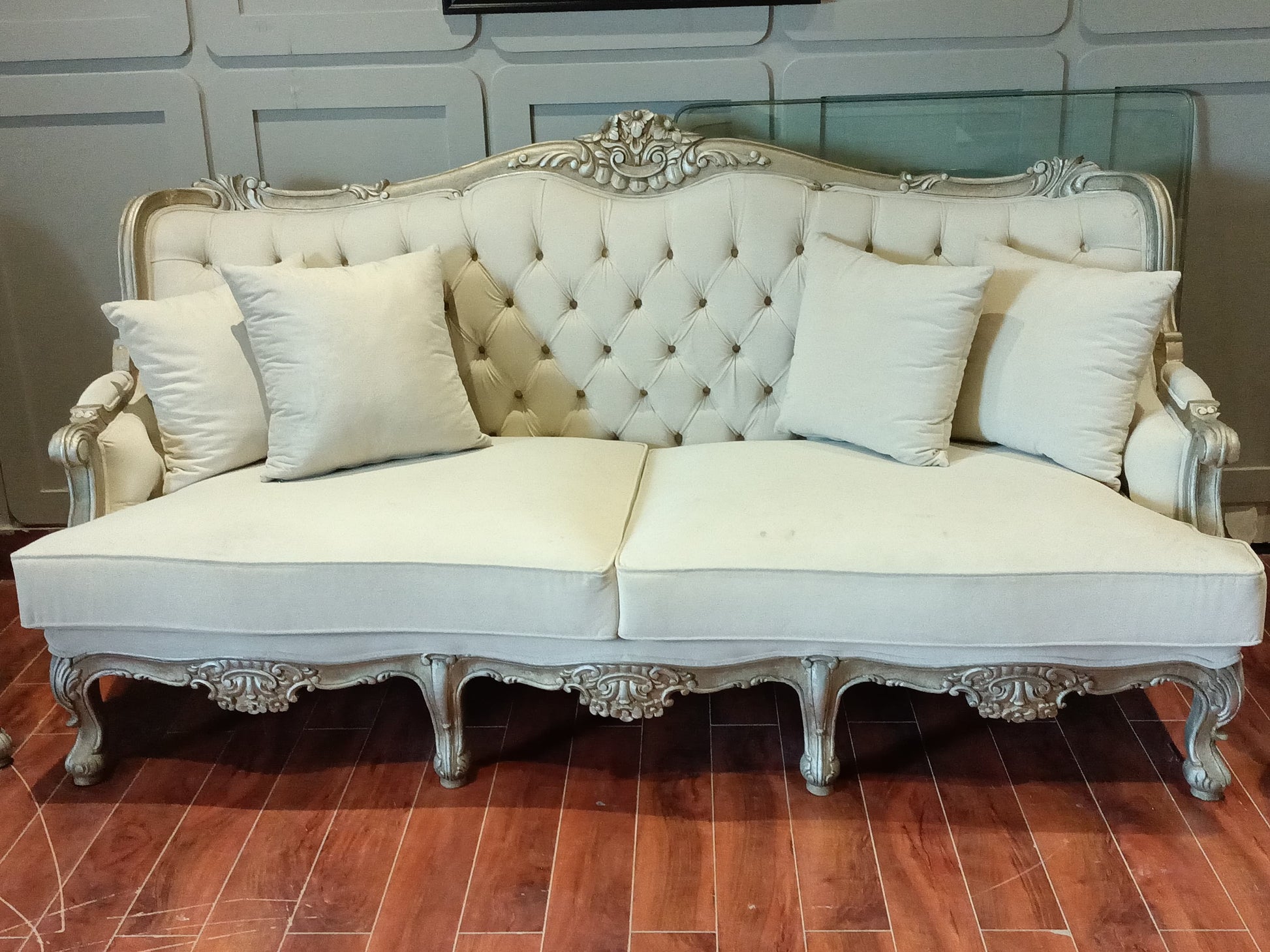 An elegant sofa with intricate wood carving and high armrests. The plush cream upholstery is both inviting and luxurious. A perfect focal point for classic living areas.