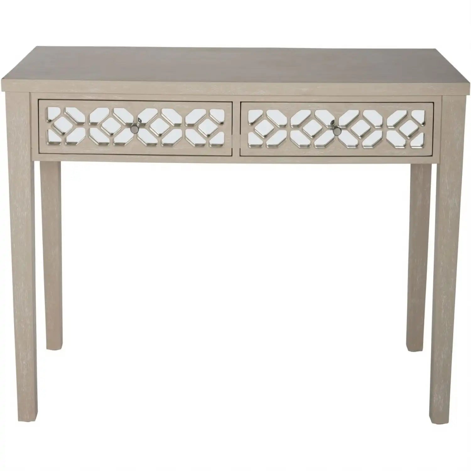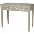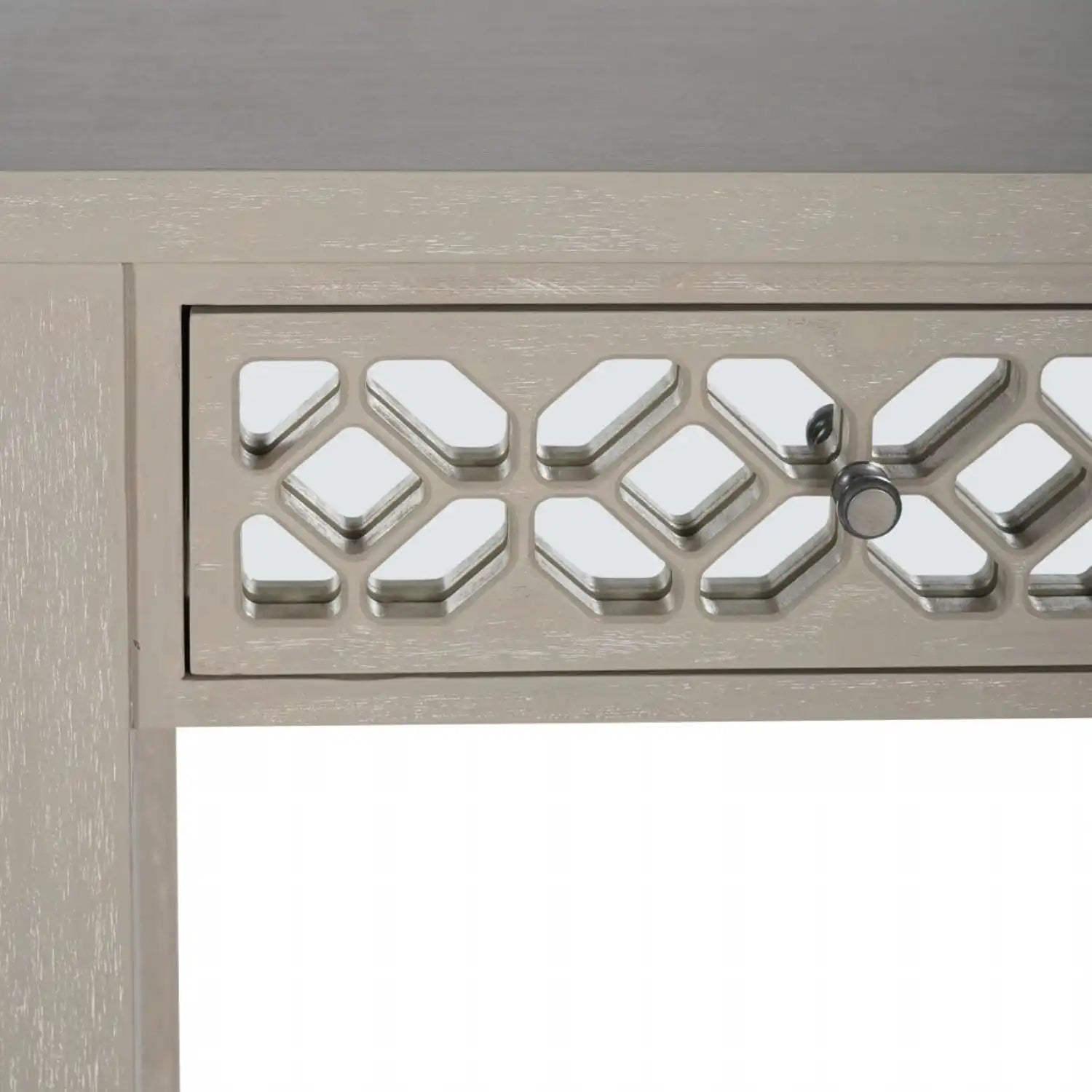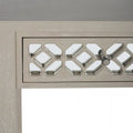 This console brings artisanal charm through its intricately carved drawer fronts, featuring an interlocking circular pattern. The soft gray-toned wood finish provides a weathered and vintage feel, while the symmetrical design maintains balance and structure. Ideal for entryways or living rooms with a rustic or cottage-style theme.