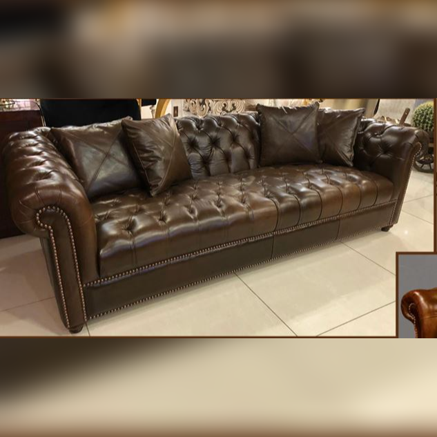 This five-seater Chesterfield sofa set brings timeless elegance with deep button tufting and high-quality brown leather. The rolled arms and plush seat promise comfort and grandeur. A true centerpiece for classic living rooms.