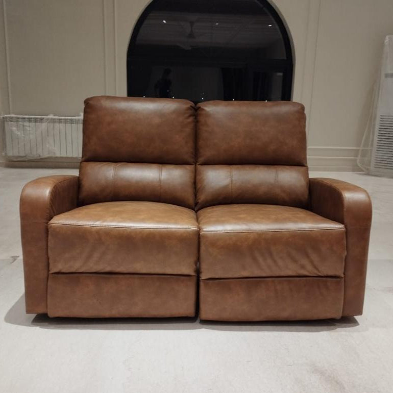 Finished in rich chestnut leather, this dual recliner provides a warm and classy touch. The plush build supports neck, lumbar, and leg comfort in tandem. It’s an elegant choice for compact luxury seating.