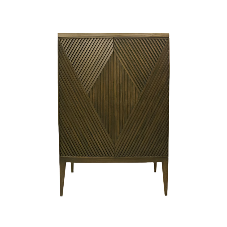 This sideboard offers an intricate chevron pattern across a two-tone wooden surface, using mixed grain directions for a textured, high-design effect. The angular composition and metallic undertones bring a modern tribal or art-deco edge to this compact yet impactful piece.