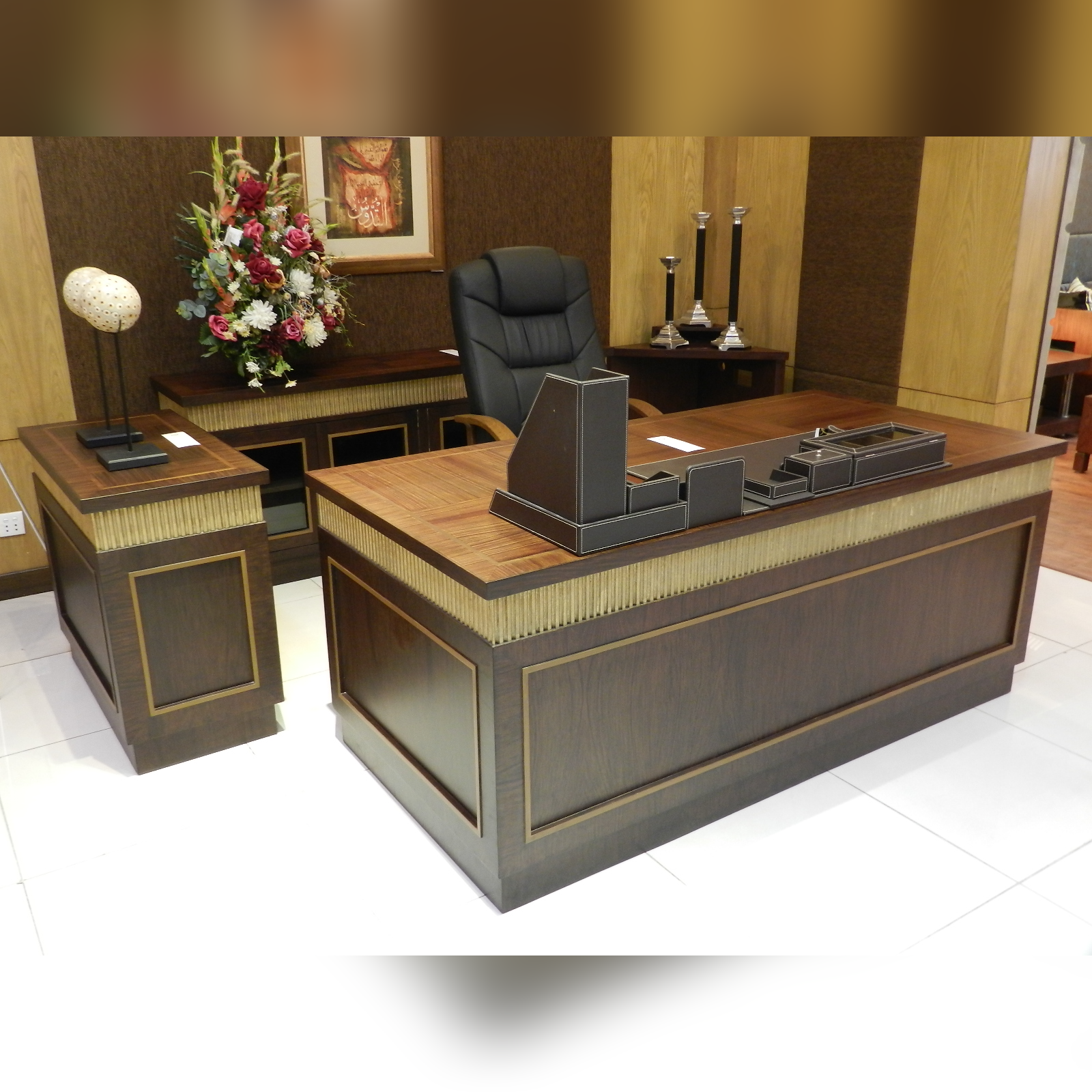 Rich dark wood construction enhanced by vertical ribbed paneling on the front and side. The desk surface is polished and spacious, suited for formal executive work. Offers a sense of authority and tradition in design.