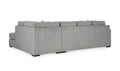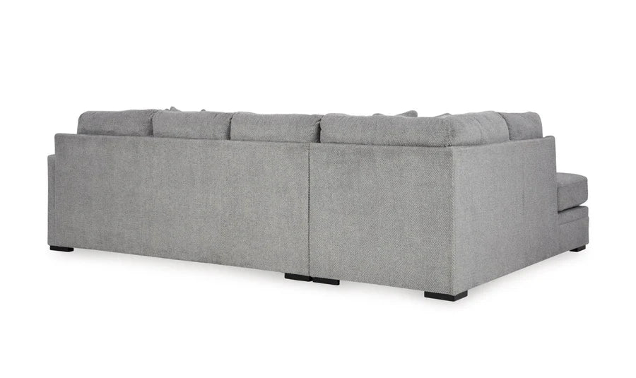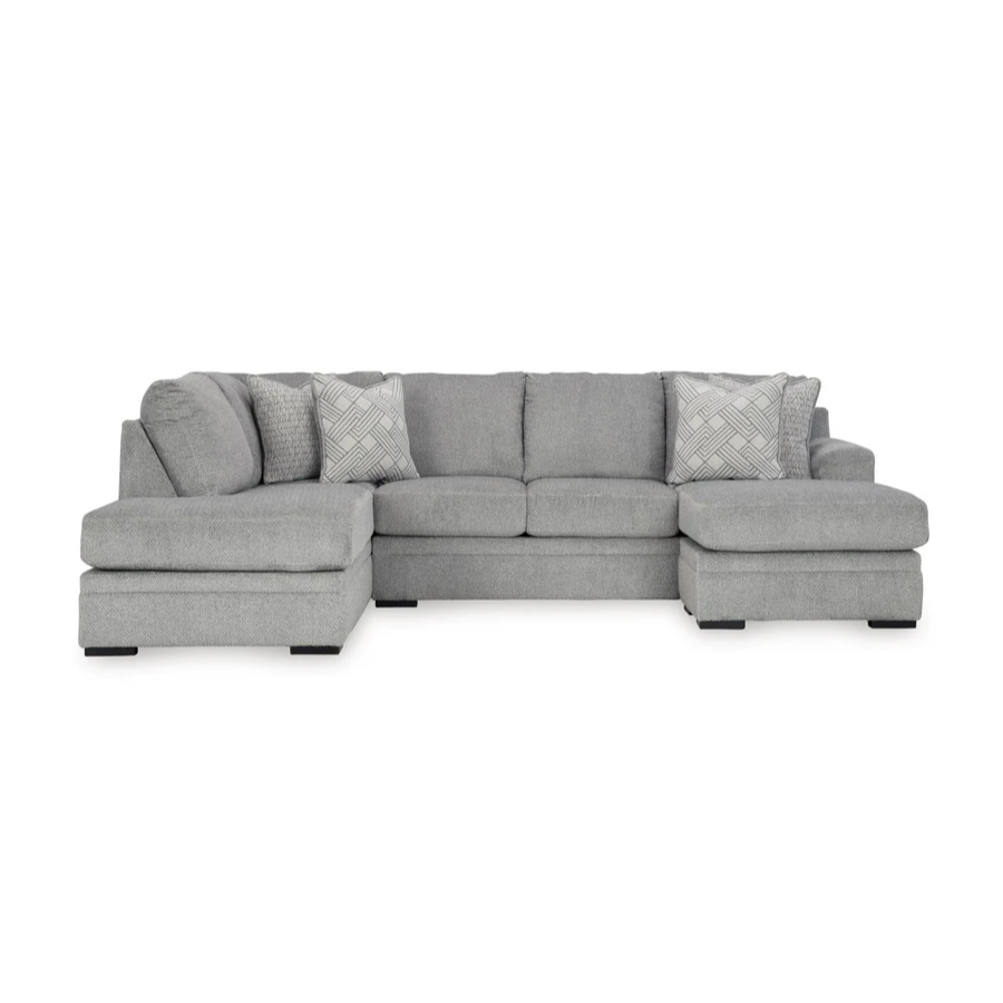 This symmetrical double-chaise sectional combines style and space efficiently. Great for lounging on both ends, the middle seating is generous. Textured fabric and included patterned cushions add contrast. Perfect for families or media rooms.