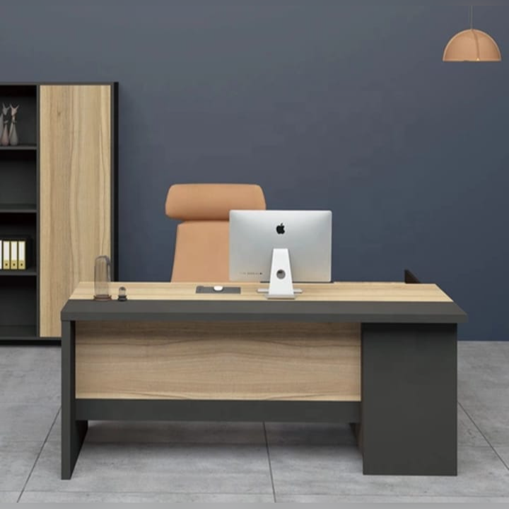 This simple executive desk uses a light oak top and dark grey base for a professional tone. With a spacious surface and panel legs, it offers understated elegance. Suitable for mid-level management or minimalist setups.