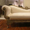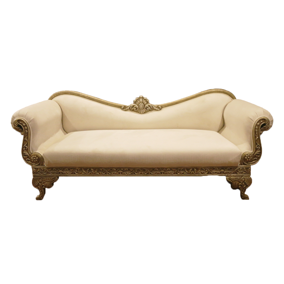 Upholstered in cream fabric with a tufted backrest, this dewan features intricate gold accented wooden carvings and rounded arms for a regal look.
