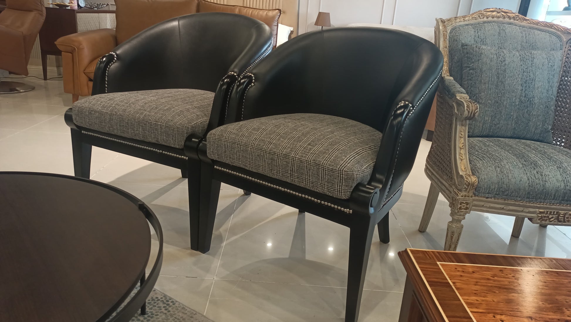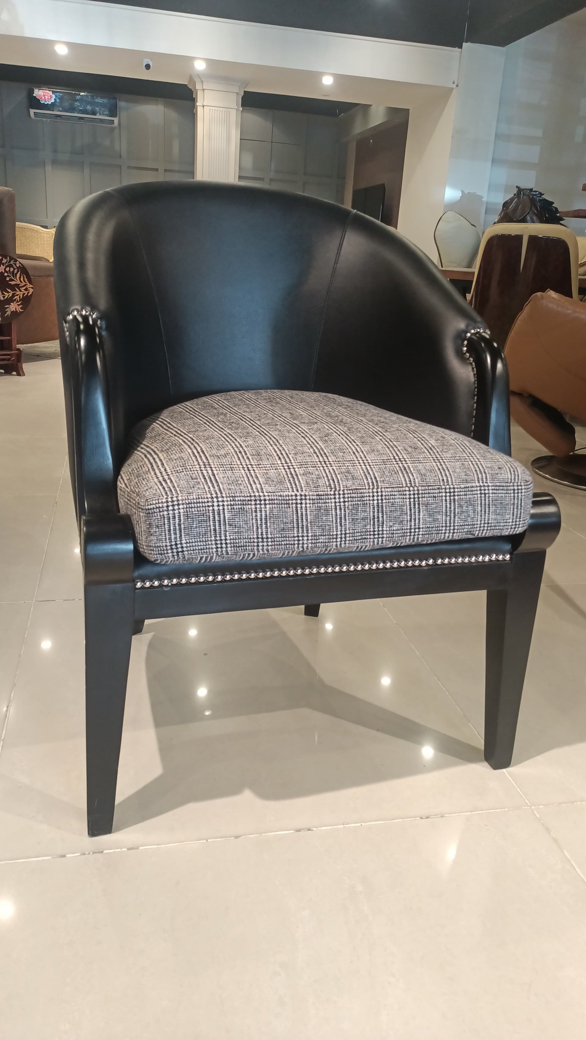 A masculine, low-profile armchair in sleek black leather with minimal detailing. Thick seat cushions rest on a solid wooden base and tapered legs. The design is bold and functional, ideal for modern lofts.