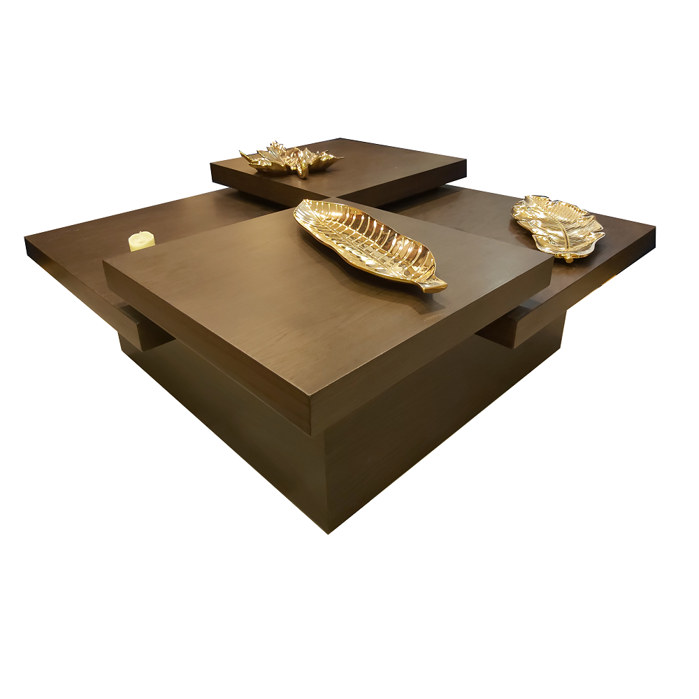 A stunning example of modern geometry, this table showcases an asymmetric layout with multiple interlocking panels in a rich brown finish. The layered structure creates interesting depth and visual intrigue, making it an ideal centerpiece in minimalist or high-concept living spaces.