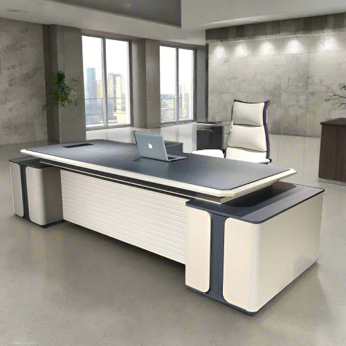 This executive desk features a stylish grey-brown wood finish with a minimalist design and a distinctive floating drawer unit. The desk incorporates sleek black accents and an extended return for added functionality and workspace. Ideal for modern professionals seeking a balance of sophistication and practicality.