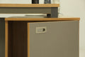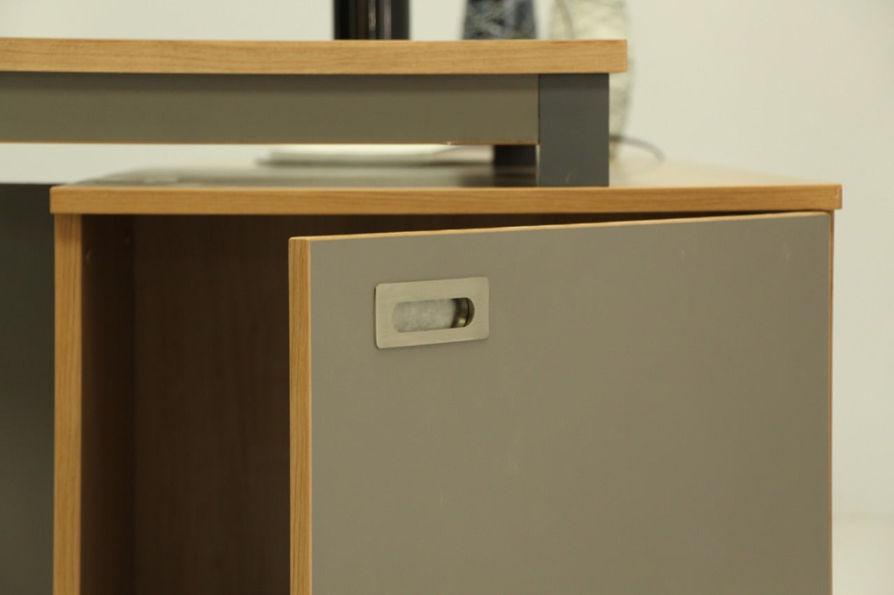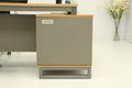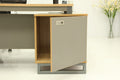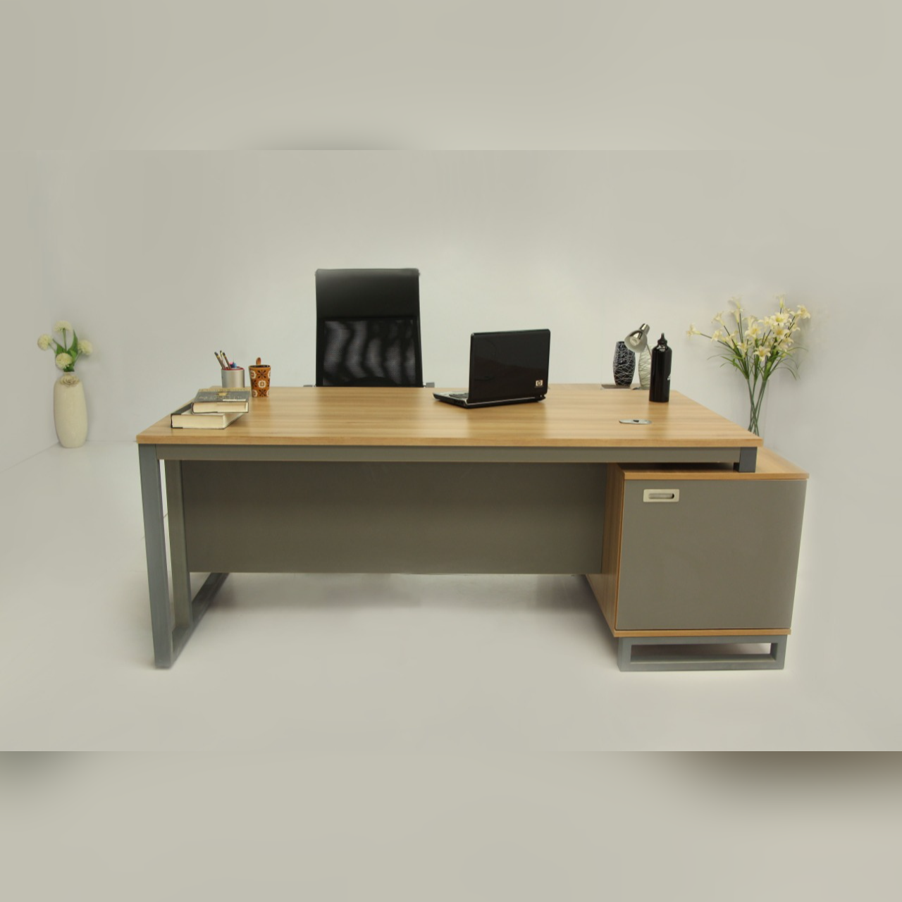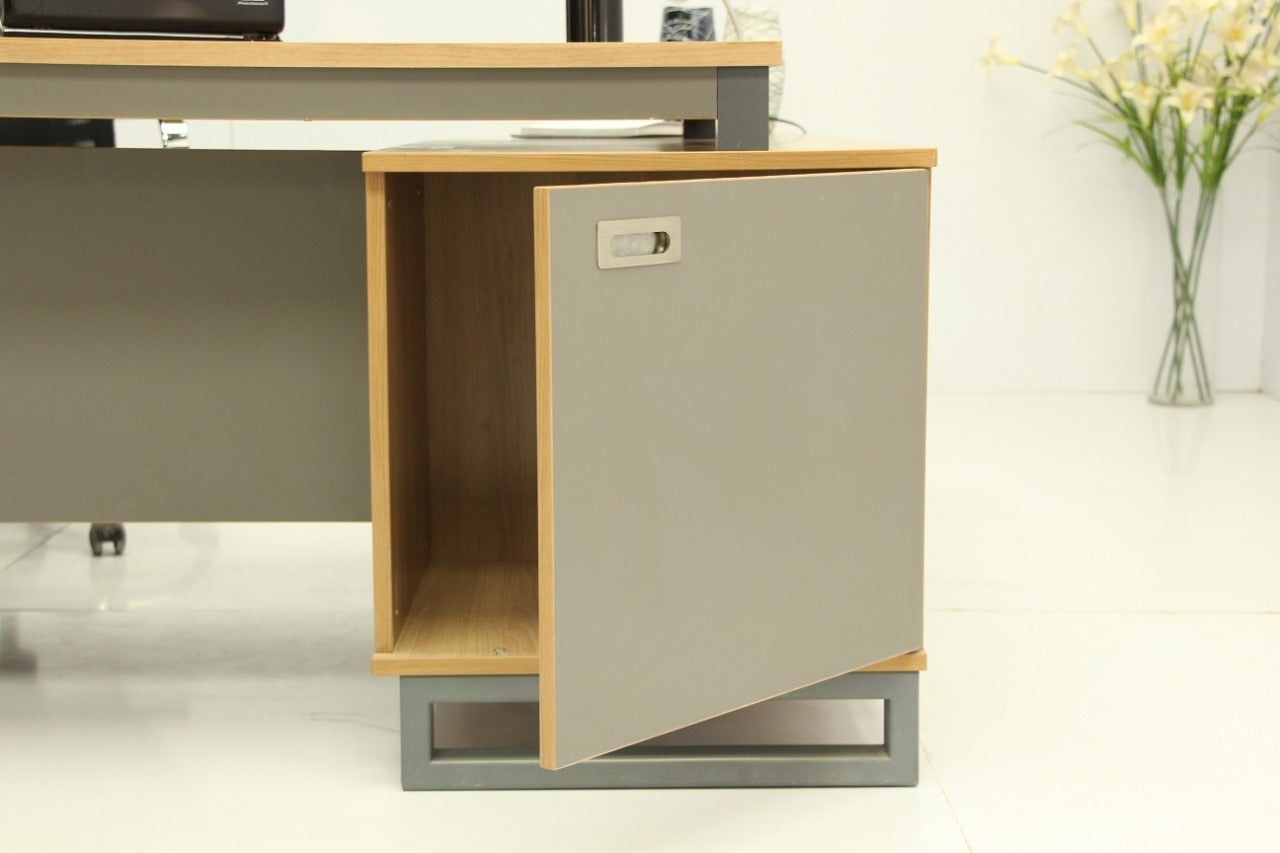 Designed with a mid-century modern twist, it features a warm wooden surface, grey side panels, and a metal leg frame. The floating drawer unit adds a modern aesthetic. Ideal for leaders who appreciate both form and function.