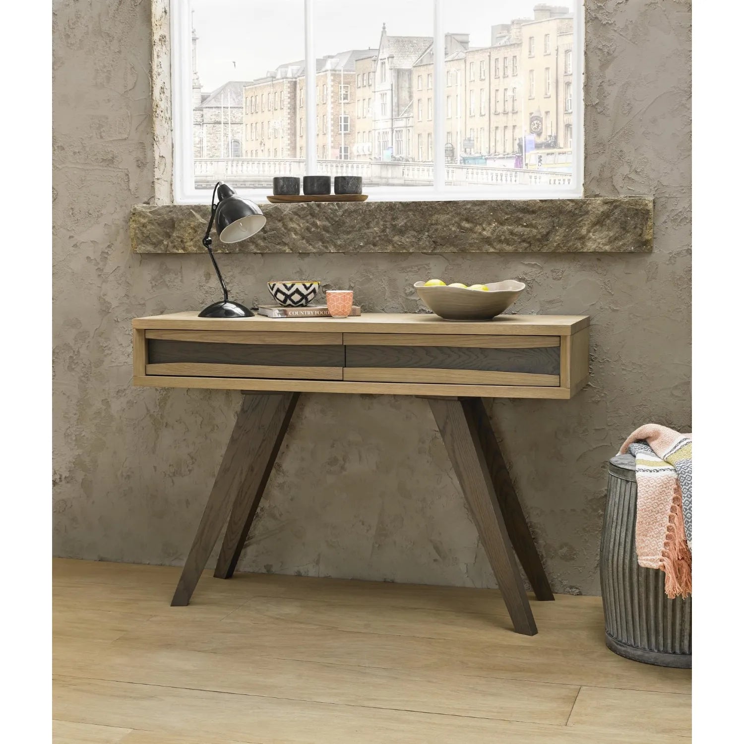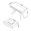 This piece merges retro and modern elements seamlessly. A boxy light-colored top with horizontal wood slat detailing contrasts against sharply angled dark legs. The drawer is discreetly embedded within the front panel, keeping the look clean and sculptural. This console is suited for eclectic or modern industrial interiors.