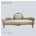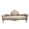 Velvet upholstered in a soft beige tone with a central circular cushion, this piece has a carved wooden frame with subtle gold detailing and scroll-style armrests.