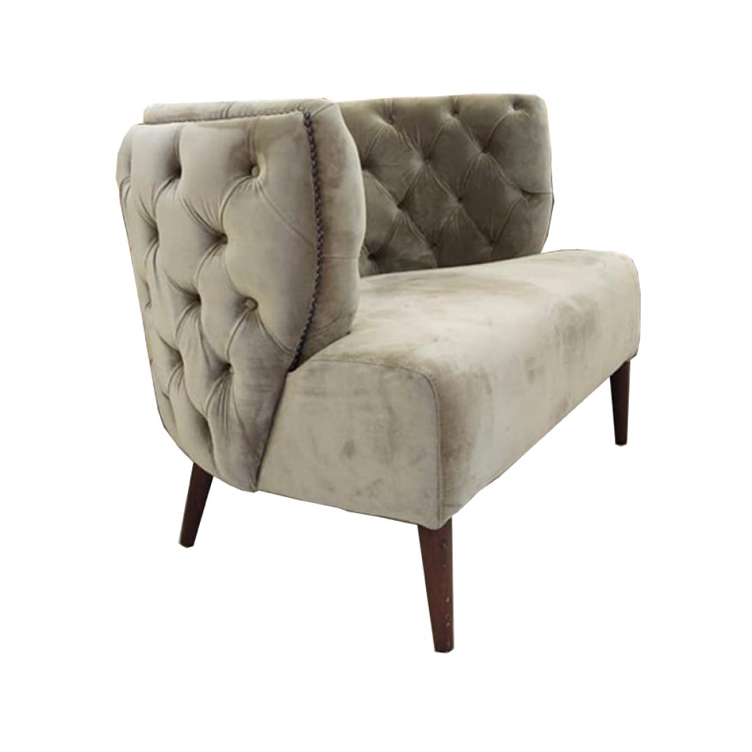 This elegant chair features deep button-tufted upholstery on the backrest and sides, exuding classic charm. The soft, velvety fabric paired with its gently curved silhouette creates a cozy yet refined look. Tapered wooden legs complete the design with a touch of mid-century sophistication.