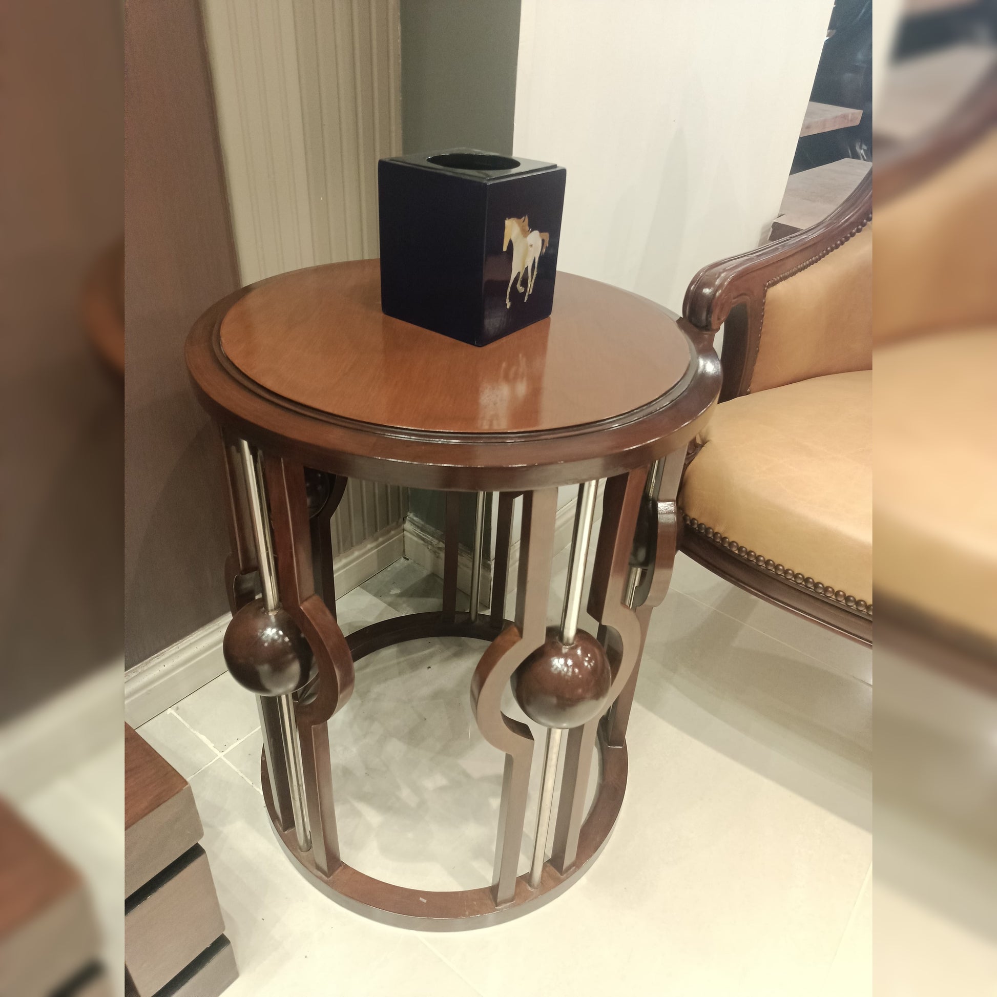 Traditional design with a round wooden top and a detailed, carved pedestal base, showcasing rich brown tones and fluted accents.